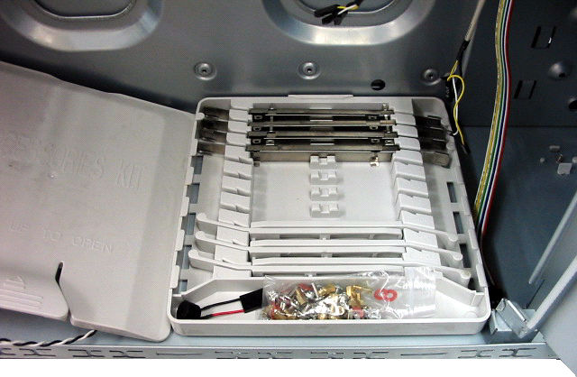 〔 IW_5インチ下 〕 下段側の5インチベイを内部から見てみました。そうそうネジレスのレールは上部ベイの4つ分しかないのでこっち側に増設するとネジ止めになるので注意。 |