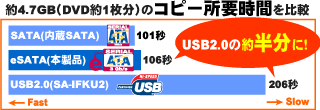 | eSATAはSATAネイティブな規格のため変換によるオーバーヘッドがなく、外付けでも内蔵SATA HD直結に匹敵する高いパフォーマンスを実現します。 |