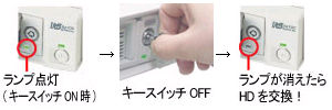キースイッチOFF時は、本体前面のトレイ通電ランプが消灯。HDへの電源切断を確認してからトレイを交換できるので、安心です。 |