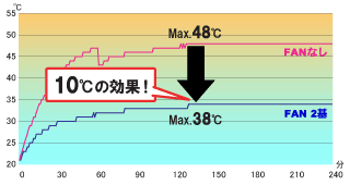 リムーバブルケース本体の背面と内部側面に、ハードディスクの安定動作をサポートする 40mm 角ファンを2基搭載。高速回転ハードディスクの長時間使用や負荷のかかる処理でも、ハードディスクの発熱によるリード/ライトエラー増加や、ディスク寿命の短命化を防ぎます。