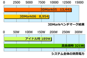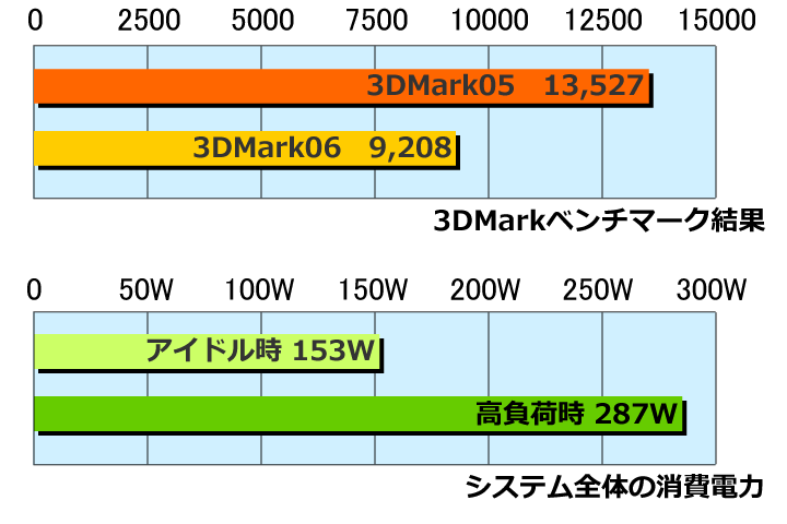 無事に3DMark05&3DMark06が動かすことが出来たので、ベンチマークを測定しました。そのときに高負荷時の消費電力も測定してあります。さすがにベンチマークが走り出しと今まで静かだったビデオカードのクーラーが高回転で回り出し、それなりの騒音を出してきます。