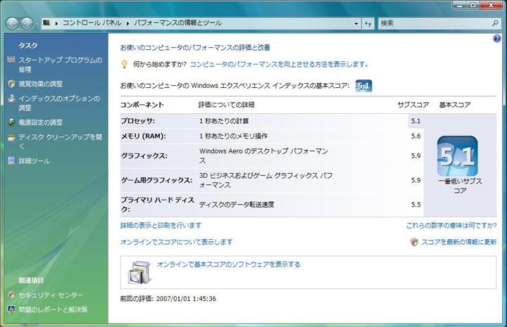 VistaのWindowsエクスペリエンスインデックスの基本スコアは…ドライバーの出来が少し心配したのですが…何ごともなく5.9と最高値を示しました。これで安心してVistaでも使えそうです。