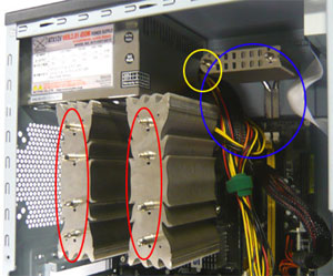 補助冷却クーラーは任意でお使い下さい。お使いのPCケースが以下のよう仕様の場合、補助冷却クーラーはご使 用になれませんのでご注意下さい。 a.マザーボードを取付けた際にマザーボードの上端から70mm以上のスペースが確保されていない(タワー型ケースの場合)。 b.aのスペース上に何らかの突起物がある。 c.ケースの横幅が180mm以下。