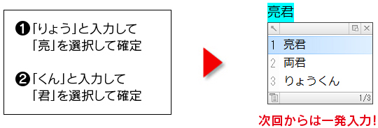 | これまで一度の入力では思うように変換できず区切り直し操作が必要だった単語を、一度細切れで入力した後はATOKが学習し、次回からはそのままスムーズに変換できるようにした機能が「細切れ変換」です。例えば、最初の設定では、一文節としては変換できない「亮君」を「りょう」「くん」とそれぞれに変換したとき、次回からは「りょうくん」と入力・変換するだけで「亮君」の候補が表示されるようになります。 |