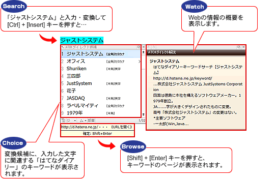 入力した言葉に関連する「はてなダイアリーキーワード」が変換候補に表示され、同時にキーワードの解説表示も行います。知りたいキーワードから新たなキーワードへ。発想支援のツールとしてもオススメです。
