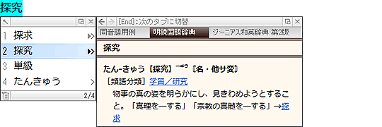 「ATOK 2008」では、複数のATOK連携電子辞典を活用しやすい画面に一新しました。 複数の電子辞典の検索結果をタブで表示し、電子辞典の切替が[End]キーだけで簡単にできるようになりました。