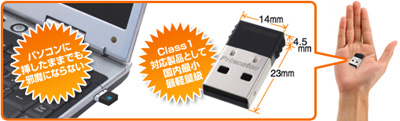 本体サイズは、出力クラスClass1製品として、日本国内で最小、最軽量級のW14.0mm×D23.0mm× H4.5mm、重さは2g。パソコン本体に接続しておいても邪魔になりにくく目立ちません※2。 小型・軽量だから持ち運びにもとても便利です。