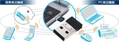ノートパソコンに取り付けたままでも邪魔にならず、また、ワイヤレスマウスや、キーボード、ヘッドセットや、ハンズフリーなど15種類のプロファイルに対応しています。