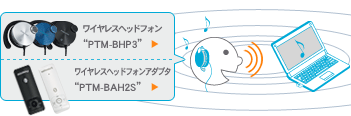 Bluetooth対応ヘッドフォン・ヘッドフォンアダプタと一緒に使えば、PCの中に入っている音楽データを、ワイヤレスで楽しむ事ができます。さらに、早送りや巻き戻しの操作も、ヘッドフォン・ヘッドフォンアダプタ側から行うことができます※。