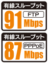 - ルーターのスループットは、FTPによる実測で「91Mbps」のスループットを発揮します。(PPPoE実測値87Mbps) (100BASE-TX LAN使用) 光サービス、高速タイプのADSLでのインターネットアクセスにも十分な転送スピードを発揮します。
