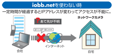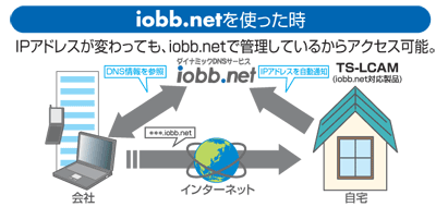 - 一般的なインターネットアクセスでは、IPアドレスは接続のたびに変化するため、外出先から自宅にアクセスしようとしてもIPアドレスがわからなければ、接続できません。アイ・オーのダイナミックDNSサービス「iobb.net」は、変化するIPアドレスに「***.iobb.net」というユーザー毎の名称をつけ、会社や外出先からのリモートアクセスを可能にする無償サービスです。