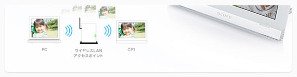 ワイヤレスLAN*に対応しているので、PC内に保存されているたくさんの写真をアクセスポイント経由でワイヤレス再生。写真をメモリーカードにコピーしなくても、手軽にPC内の写真を楽しめます。