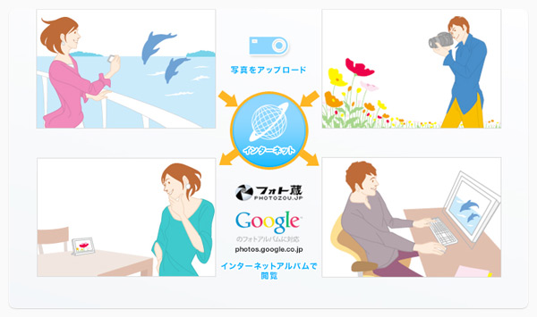誰もが自由に、自分が撮影したオリジナルフォトを公開できる、インターネットアルバム。「CP1」なら、「Google」のフォトアルバムや「フォト蔵」のインターネットアルバムの写真もPCを立ち上げずに、お手元の「CP1」で楽しむことができます。さらに、「CP1」本体で、撮影したメモリーカード内の写真をインターネットアルバムへアップロードできますので友だち同士で写真をシェアして楽しむことも可能です。