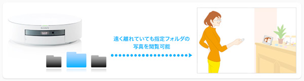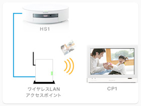 「HS1」の「メディア共有」を使えば、友だちや遠く離れた家族が「HS1」の指定フォルダに保存した写真を「CP1」で楽しむことができます。インターネットアルバムへ写真をアップロードすることに抵抗のある方でも安心です。
