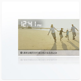 - お気に入りの写真を飾ったまま、時刻表示や「Yahoo!ニュース・トピックス」を表示したり、音楽を流すことができます。まるでテレビや携帯電話の待ち受け画面のように、お手持ちのデジタルフォトを楽しめます。