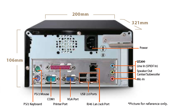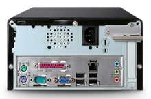 | 「XC Cube LE200」は、小型Cubeでありながらも現在使用されているさまざまな周辺機器を利用するために十分な接続端子を装備しています。USB2.0を合計 6系統(前面2系統、後部4系統)に装備しております。モニタ出力はD-sub(15PIN)。