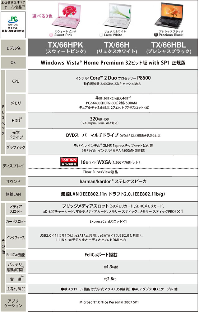 定番CPUのCore 2 Duo、32bitOSの限界を超える4GBメモリ、余裕のある320GBのHDD搭載と、中身の方もバッチリ。