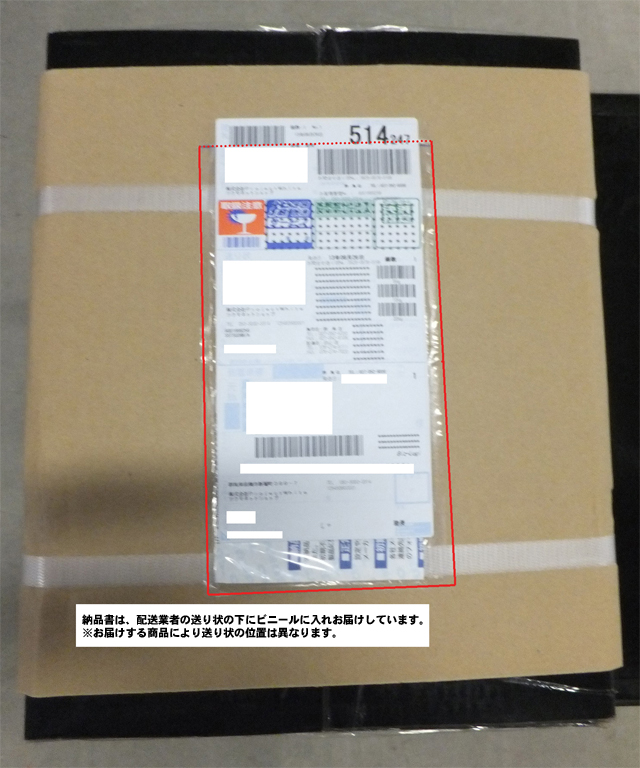 納品書は、配送業者の送り状の下にビニールに入れお届けしています。