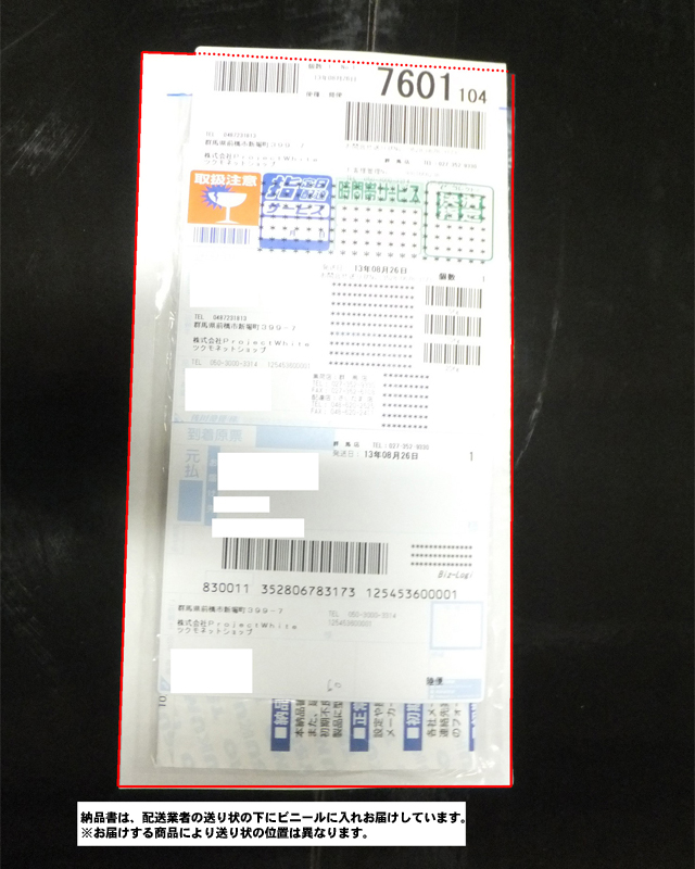 大型商品等、メーカー梱包のままお送りしている商品の場合、納品書は送り状の下に添付してお送りいたしております。 - 納品書には価格の記載は行っておりません、「ご注文完了メール」にてご確認お願い致します。